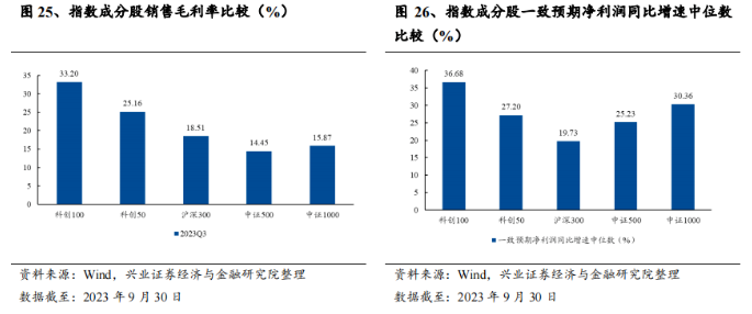 兴业证券指出,科创板100指数盈利能力优秀,净利润增长预期较高:2023年第三季度,科创100指数成分股销售毛利率显著高于沪深300、中证500及中证1000等宽基指数,展现出优秀的盈利能力。同时,科创100成分股一致预期净利润同比增速中位数为36.68%,领先于主流宽基指数。结构上,四季度在成长和价值之间反复,市场底向上的过程倾向于成长将更占优一些(汽车零部件+医药+半导体+算力),指数上看好科创100指数。