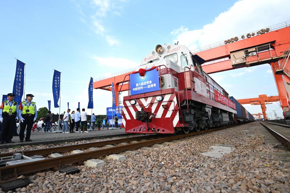 △2023年10月11日,今年第一列“中欧班列—进博号”抵达上海闵行站。