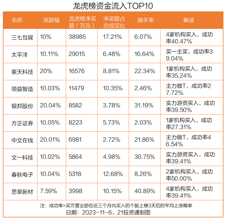 11月6日,上证指数上涨0.91%,深证成指上涨2.21%,创业板指上涨3.26%。盘后龙虎榜数据显示,共有40只个股因当日异动登上龙虎榜,资金净流入最多的是三七互娱(002555.SZ),达3.9亿元。