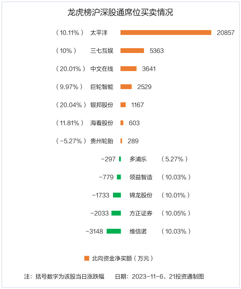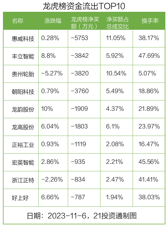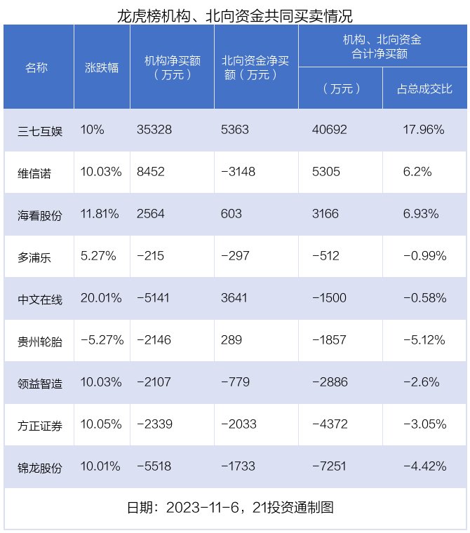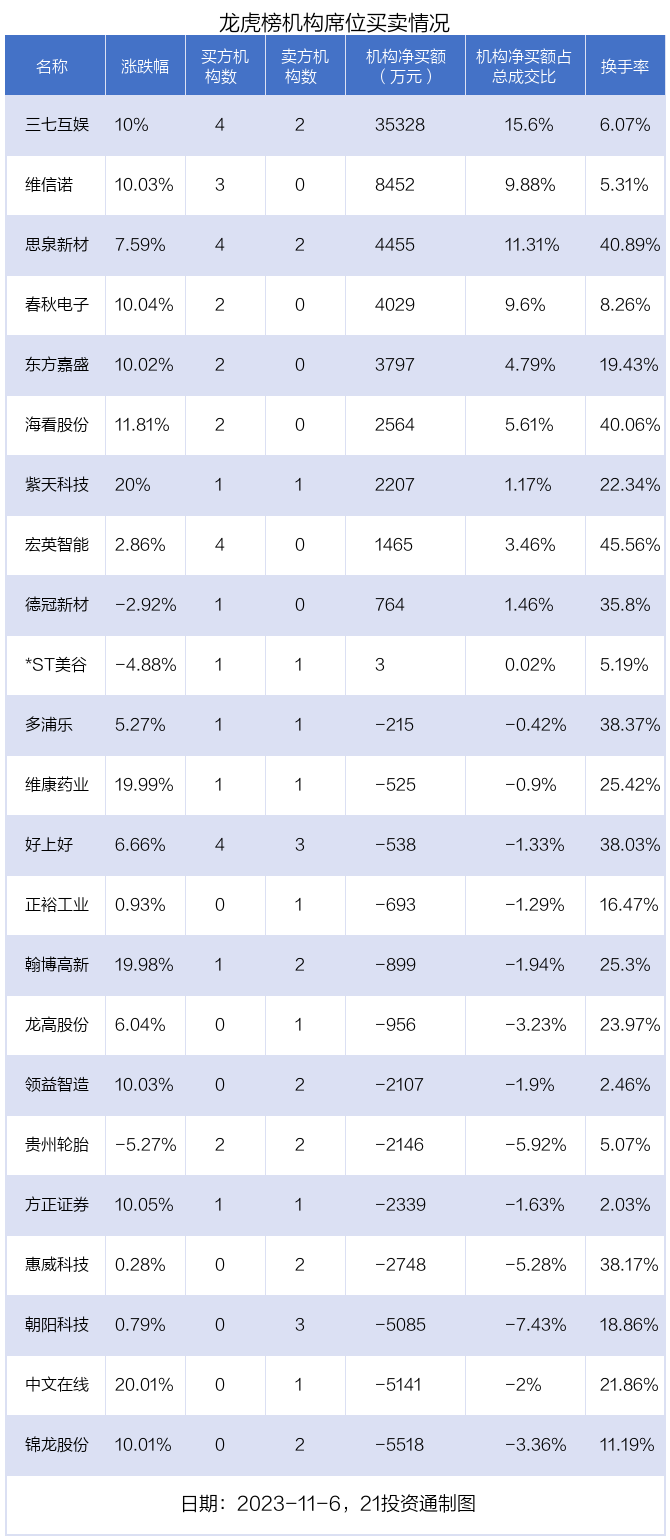 11月6日,23只个股龙虎榜出现了机构的身影,机构合计净买入3.42亿元。具体来看,机构净买入10股,净卖出13股。