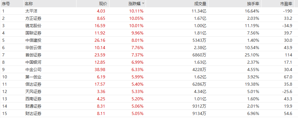 11月6日,券商板块大幅高开,全天维持强势。太平洋、方正证券、锦龙股份等涨停,中信建投、华创云信、首创证券等多只成分股涨幅在5%以上。