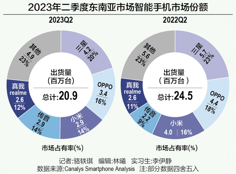 根据调研机构Canalys最新统计,2023年二季度在东南亚智能手机市场,三星、OPPO、传音、小米、realme位列前五,中国厂商的市场份额合计58%。