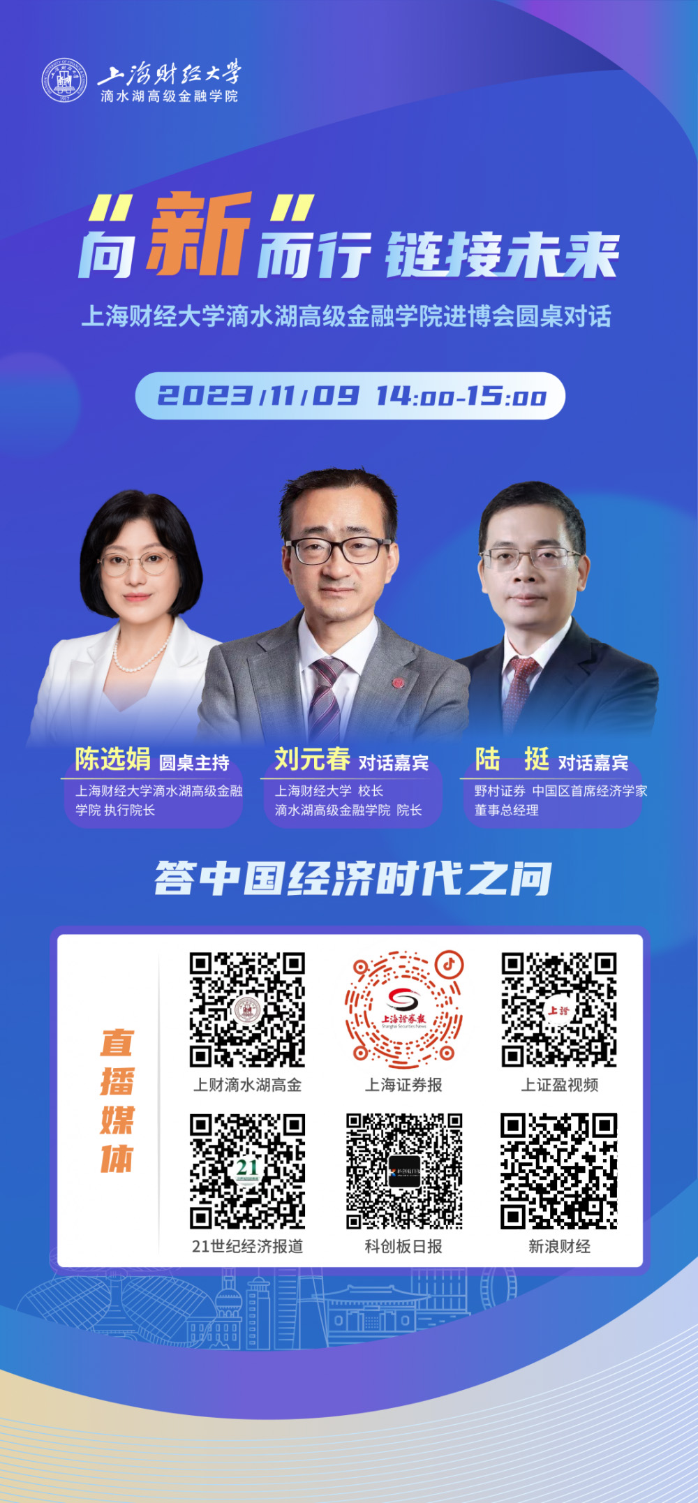 致力于弘扬百年商学文化,成为引领新兴金融发展的国际一流金融学院,作为“临港方阵”中重要一员,上财滴水湖高级金融学院奔赴进博之约。11月9日,学院将开展一场“向新而行,链接未来”主题圆桌对话。上海财经大学校长、滴水湖高级金融学院院长刘元春,野村证券中国区首席经济学家、董事总经理陆挺,上海财经大学滴水湖高级金融学院执行院长陈选娟联袂对话,共同探讨当下经济时代之问。
