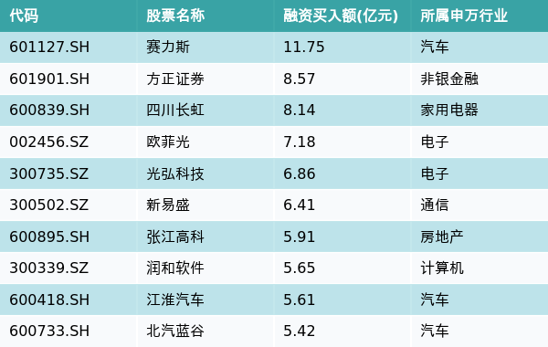 11月8日,两市共有3298只个股有融资资金买入,其中赛力斯、方正证券、四川长虹排名前三,买入金额分别11.75亿元、8.57亿元、8.14亿元。融资买入额前10个股详情见下表: