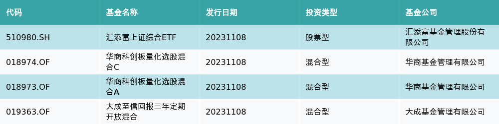 11月8日有4只新基金发行,分别为:汇添富上证综合ETF、华商科创板量化选股混合C、华商科创板量化选股混合A、大成至信回报三年定期开放混合,详情见下表: