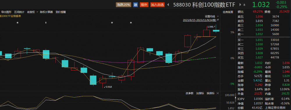 规模最大的跟踪科创100指数的ETF——科创100指数ETF(588030)早盘一度涨近1%,后跟随大盘走低,走弱后溢价交易较为明显,截至午间收跌0.29%,盘中溢折率0.14%,半日成交额5.42亿元,换手率12.06%。