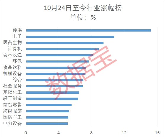 A股自10月23日下探至近一年低点后,近期上证指连续3周走高。10月24日至11月10日,上证指数单边上行,累计涨幅3.39%,深证成指涨5.86%,创业板指涨7.52%。
