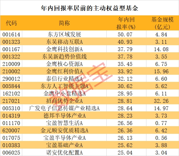 数据宝统计,截至目前,在主动权益型基金产品中,表现最好的是东方区域发展,年内回报率高达50.07%,也是唯一一只回报率超过50%的基金;第二名是东吴移动互联A,年内回报率40.93%;第三至第五位分别为金鹰科技创新A、东吴新趋势价值线、金鹰核心资源A,年内回报率均在35%以上。