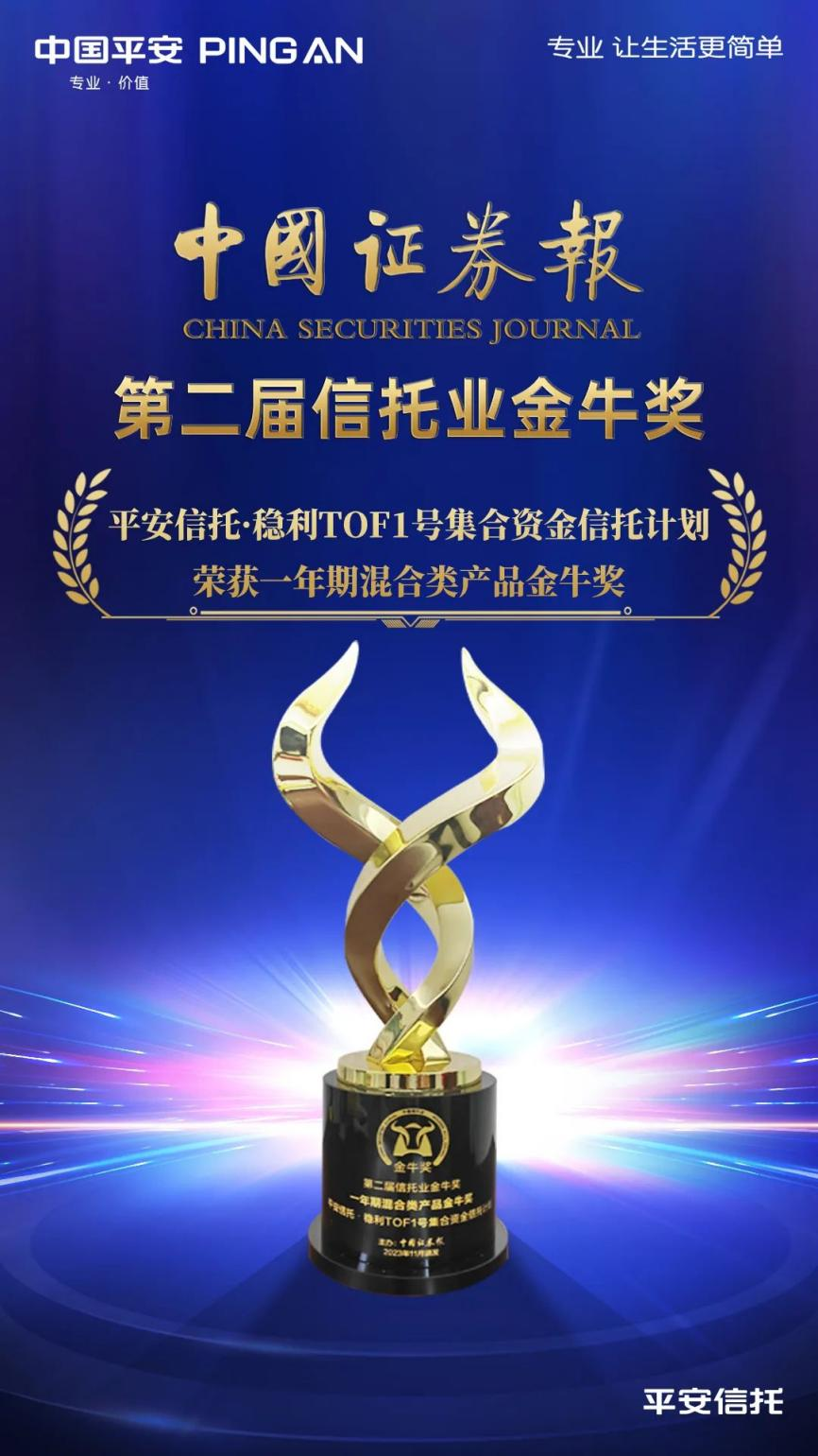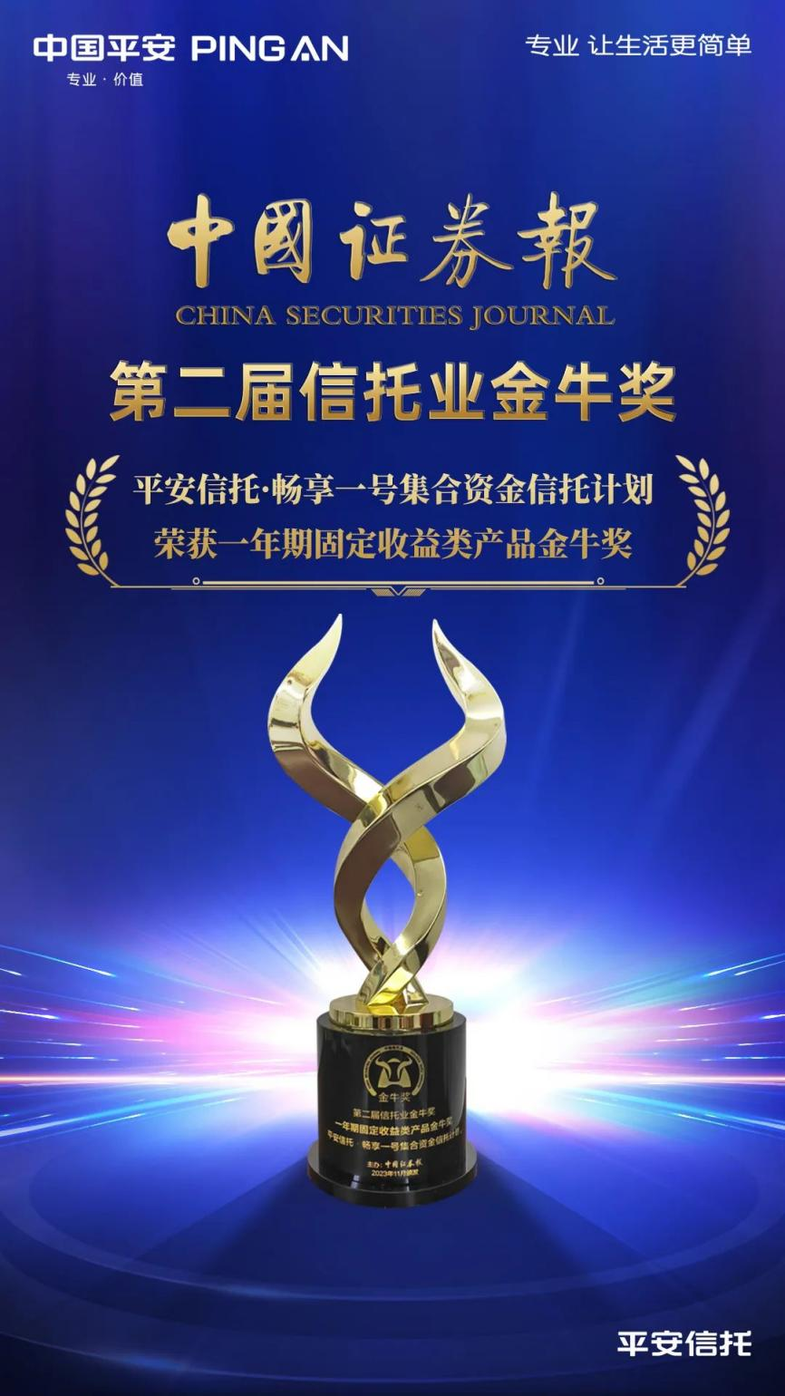 11月11日,由《中国证券报》主办的“聚合力 育新质 启新程——2023银行保险业财富管理论坛暨第四届银行业理财金牛奖、第三届保险业投资金牛奖、第二届信托业金牛奖颁奖典礼”在北京成功举行。平安信托·畅享一号集合资金信托计划、平安信托·稳利TOF1号集合资金信托计划凭借优异的市场表现,分别斩获“一年期固定收益类产品金牛奖”“一年期混合类产品金牛奖”两项重磅大奖,平安信托也成为本次评选中获奖产品最多的信托公司之一。