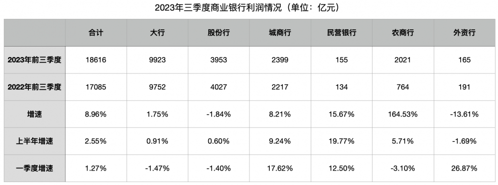 不过,据2023年商业银行主要监管指标情况表测算,前三季度,商业银行实现净利润18616亿元,同比增长8.96%,实现连续两个季度环比提升。