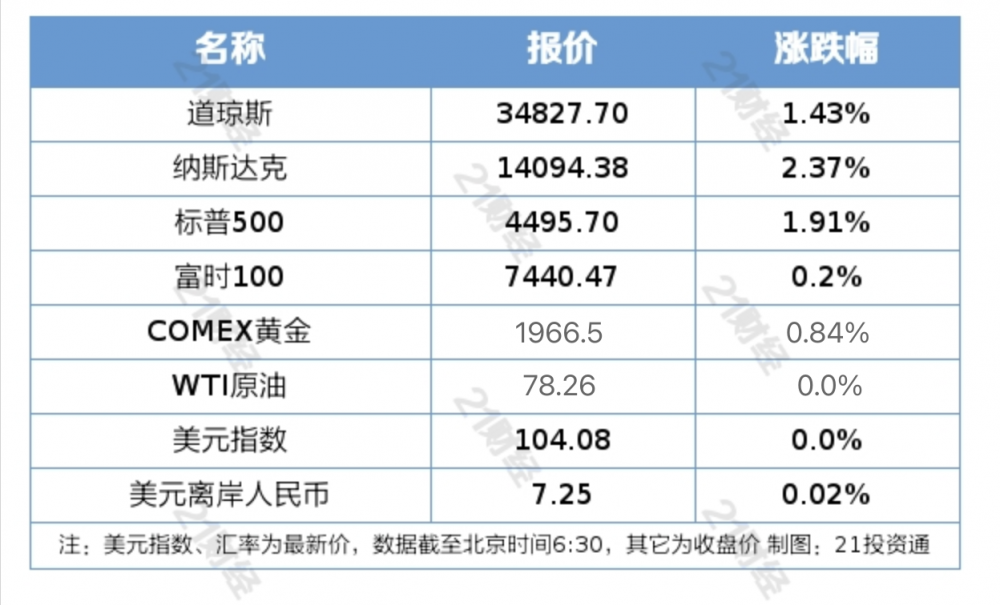 纽约三大股指14日全线收涨。截至当天收盘,标普500指数涨1.91%,报4495.70点;道指涨1.43%,报34827.70点;纳指涨2.37%,报14094.38点。
