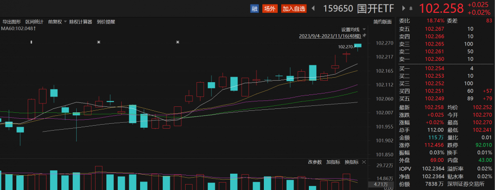 11月16日,三大指数集体低开,反观债券市场,国开ETF(159650)今日平开盘中走强,现涨0.02%。该ETF流动性较好,上个交易日单日成交额超21亿元,在各类深交所ETF产品中排名靠前。