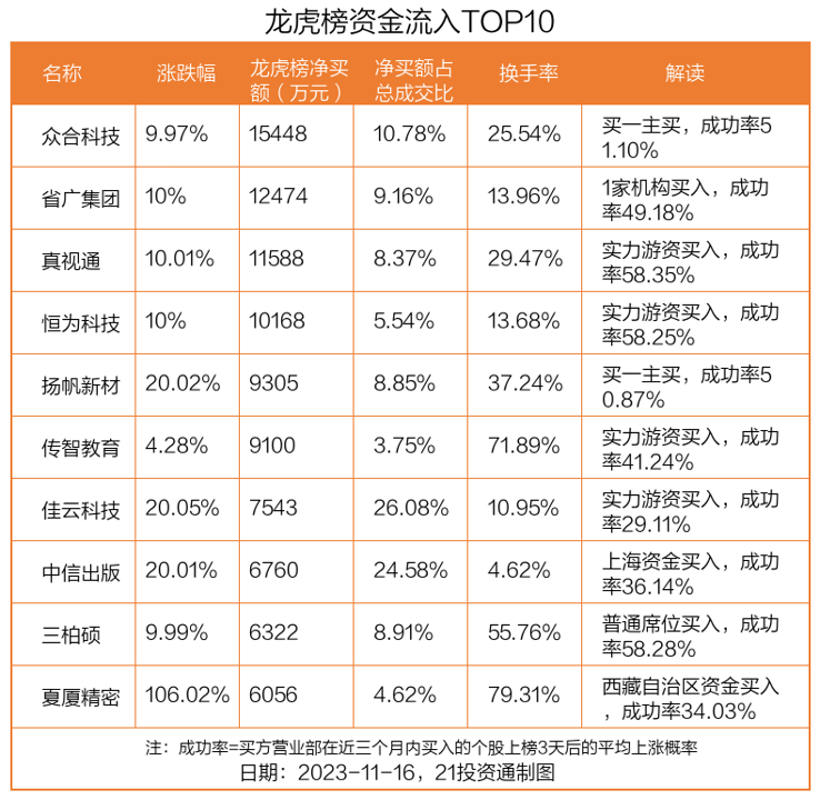 11月16日,上证指数下跌0.71%,深证成指下跌1.23%,创业板指下跌1.85%。盘后龙虎榜数据显示,共有41只个股因当日异动登上龙虎榜,资金净流入最多的是众合科技(000925.SZ),达1.54亿元。