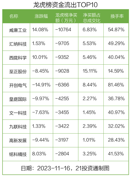 而龙虎榜中资金净流出最多的是威唐工业(300707.SZ),被净卖出为1.08亿元,占总成交金额的6.83%。威唐工业收盘上涨14.08%,换手率为54.87%。