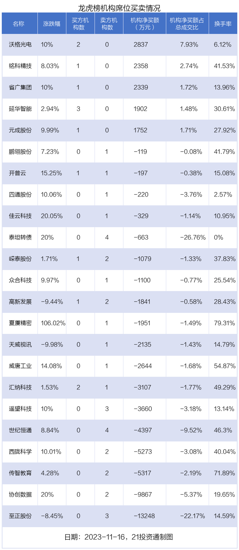 11月16日,23只个股龙虎榜出现了机构的身影,机构合计净卖出4.6亿元。具体来看,机构净买入5股,净卖出18股。