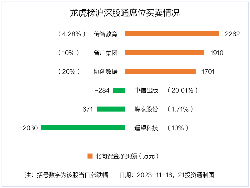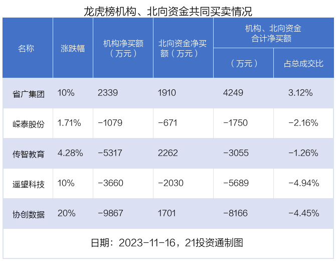 值得注意的是,机构和北向资金共同净买入了省广集团;共同净卖出了嵘泰股份、遥望科技等2股;在传智教育,协创数据上出现分歧,机构净卖出传智教育5316.78万元,北向资金净买入2261.92万元;机构净卖出协创数据9867.37万元,北向资金净买入1701.28万元。