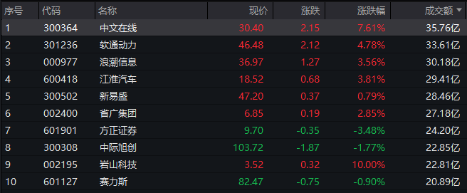 沪深两市半日成交额5783亿,较上个交易日同期放量833亿。个股方面,中文在线成交额35.76亿元居首,软通动力、浪潮信息成交额均超30亿元,分别为33.61亿元、30.18亿元。江淮汽车、新易盛、省广集团成交额均超25亿元。