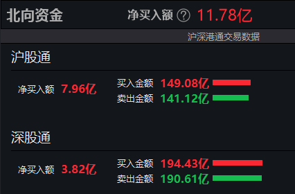北向资金半日净买入11.78亿元。其中沪股通净买入7.96亿元,深股通净买入3.82亿元。