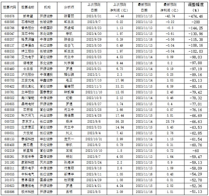 被下调今年盈利预测值公司中,新希望(000876)遭下调幅度居首位。《投资快报》投研通数据显示,开源证券分析师陈雪丽在11月15日发表的报告中,预计新希望2023年净利润为-42.74亿元,而其在8月31日的研报中预计为-7.44亿元;按此计算,陈雪丽本次下调新希望净利润预测值幅度较巨大。
