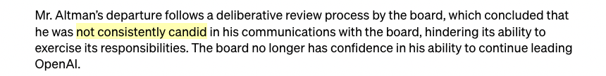 同一时间,Open AI官网迅速发布一篇文章宣布Sam Altman被解雇的决定,在阐释原因时用了“始终不坦诚”的评价形容Altman和董事会的沟通,使得董事会对他的领导失去了信心。
