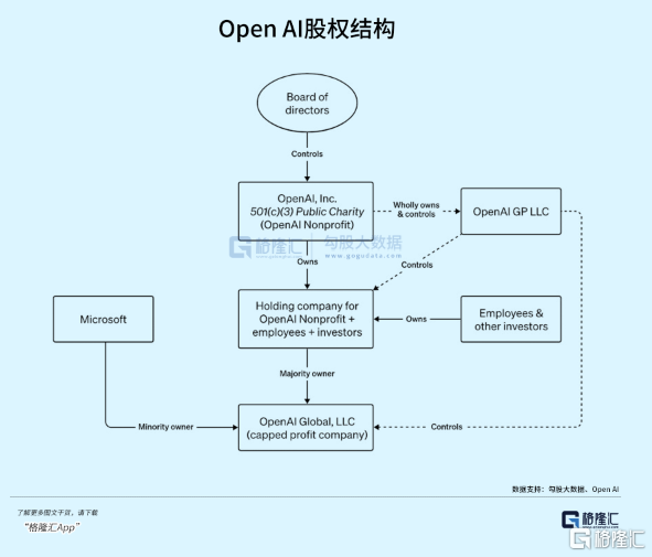 Open AI的结构不寻常,他的营利主体是由一个非营利性501(c)(3)公共慈善机构拥有,前者可以接受投资并设定回报率,但是要在后者的治理下展开运作,而后者又由董事会来领导。