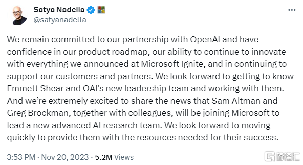 而累计已经在Open AI上花了130亿美元的微软成了和事佬,既然要求Altman回归的谈判走向破裂,这边与Open AI还要继续合作,不得不将两人先收入麾下,放在一个新的AI研究团队下,也给其他想跟着Altman跳槽的员工吃了颗定心丸,防止人才资源迅速地涌向竞争对手。
