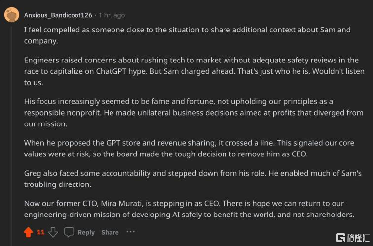 大意就是,公司首席科学家兼董事会成员Ilya主导了此次“政变”,先后在两人不在场的情况下,召开会议将Sam和Greg除名,Sam被直接解雇,原本可以留下来的Greg火速辞职。除了接任CEO的米拉在前一天晚上知晓,管理团队其他成员都是临时才知道这次人事巨震。