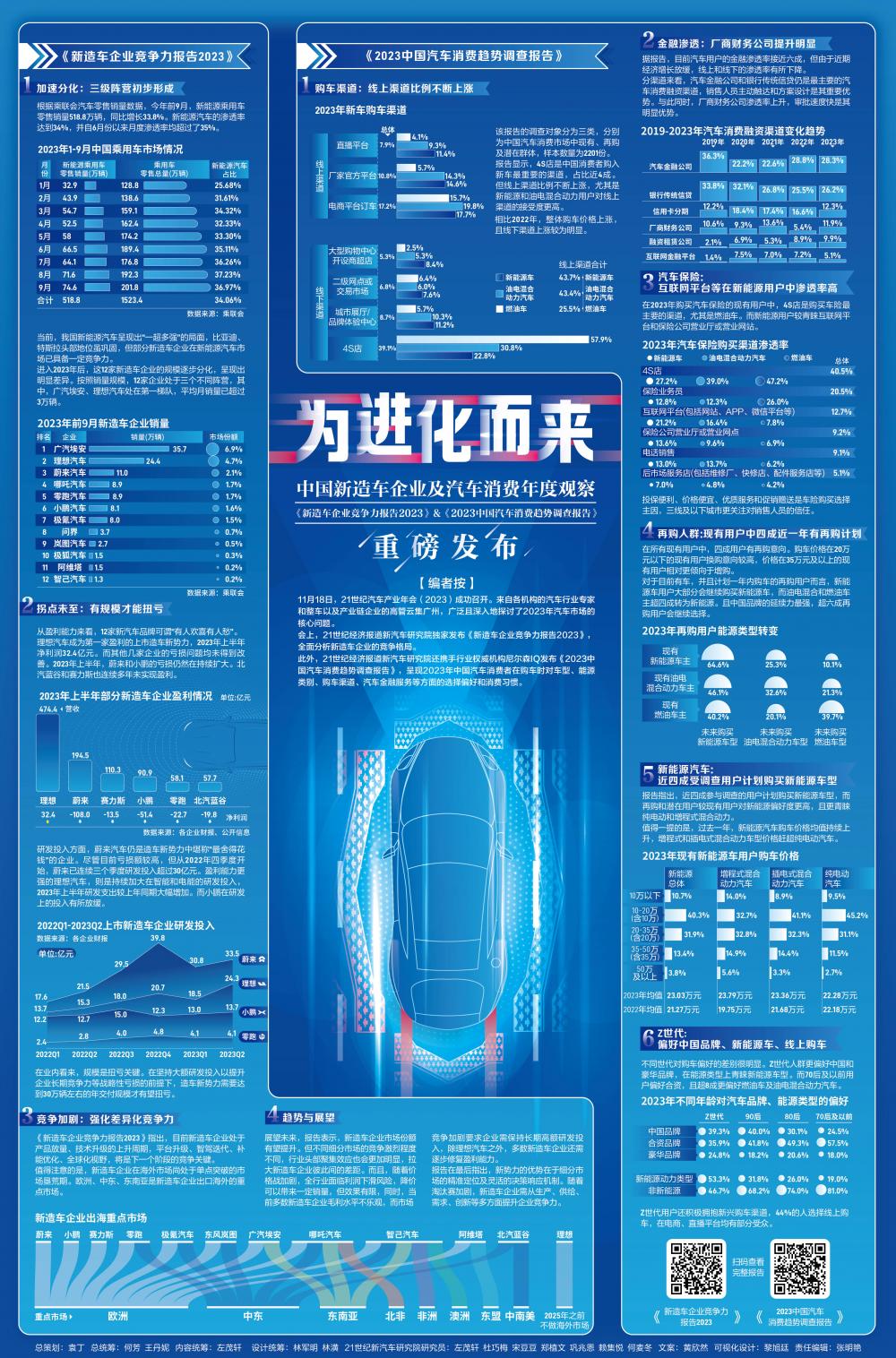 此外,21世纪经济报道新汽车研究院还携手行业权威机构尼尔森IQ发布《2023中国汽车消费趋势调查报告》,呈现2023年中国汽车消费者在购车时对车型、能源类别、购车渠道、汽车金融服务等方面的选择偏好和消费习惯。
