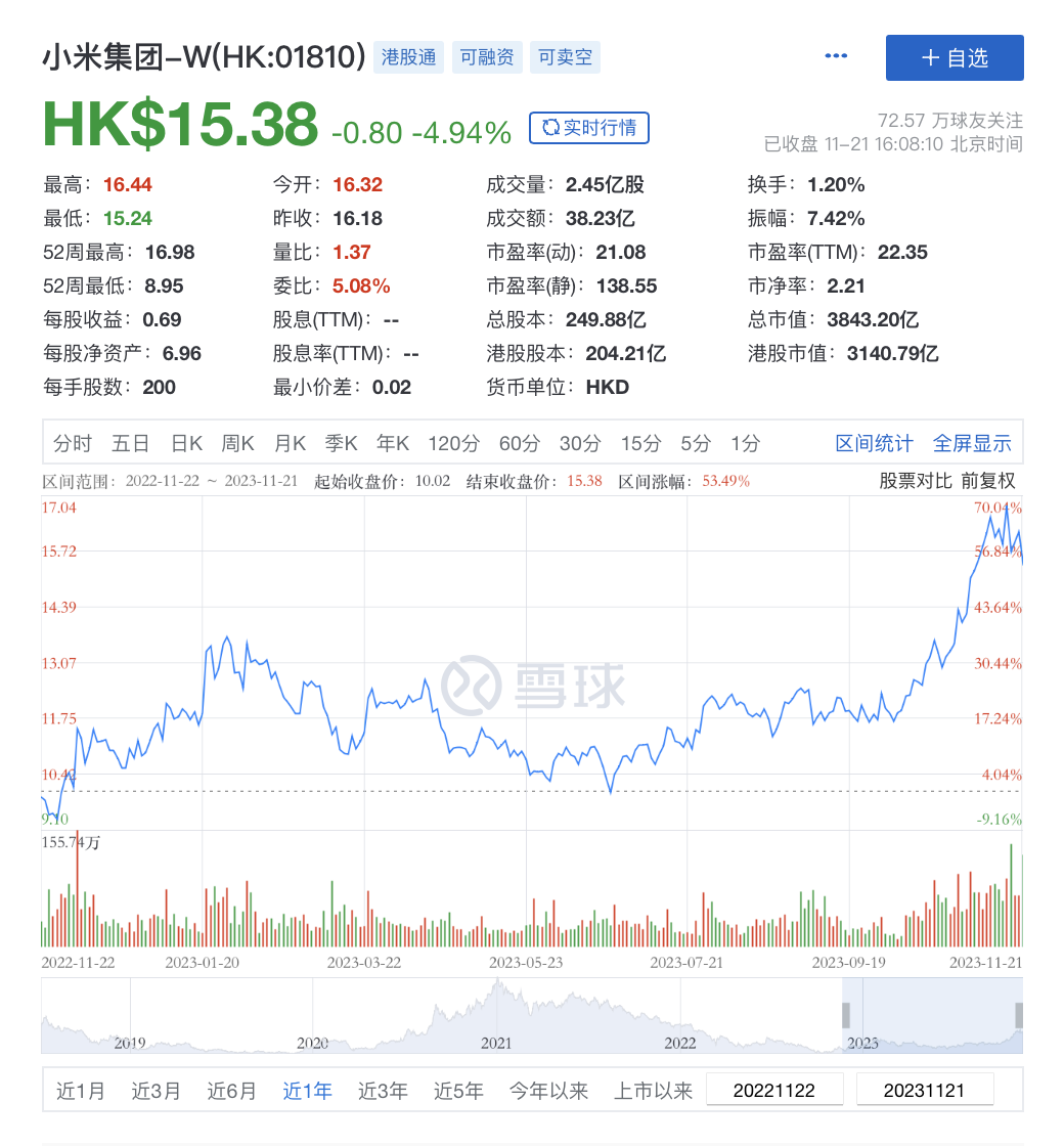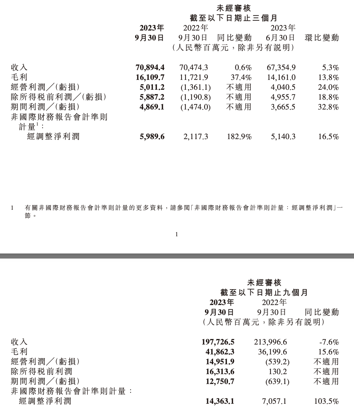 小米2023年前三季度经调整净利润143.63亿元,约为2022年全年的1.7倍。