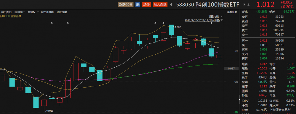跟踪科创100规模最大的ETF——科创100指数ETF(588030)早间一度跌0.59%,随后快速拉升,V型反弹,午间收涨0.20%,半日成交额5亿元,居首批上市的同标的产品首位,换手率9.55%,盘中交投活跃。