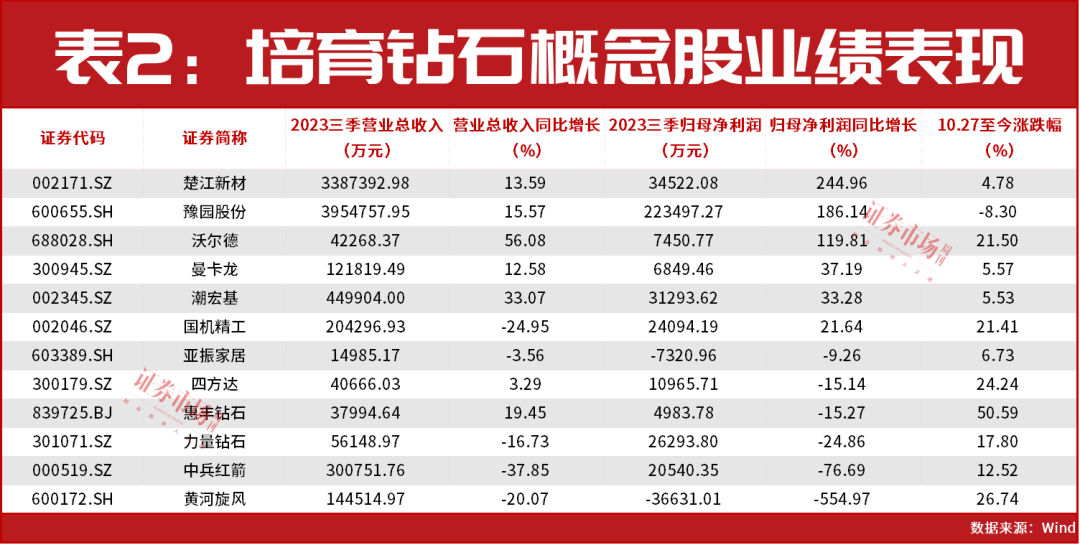 在机构重仓持有或持续关注的背后,是培育钻石概念股业绩的不断向好发展。如沃尔德,今年前三季度公司实现营业收入4.23亿元,同比增长56.08%,实现归母净利润7450.77万元,同比增长119.81%。
