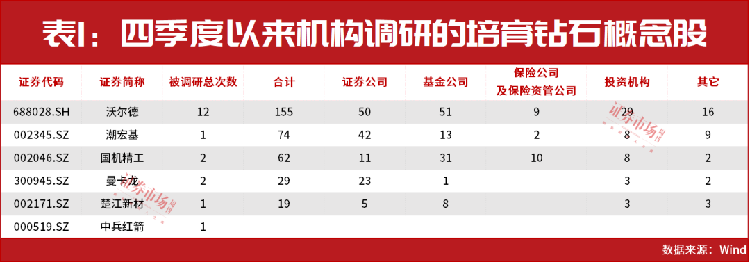 根据机构的最新调研情况也可以看到,四季度以来,已有6家培育钻石概念股获得了机构的关注(见表1)。在沃尔德10月13日的调研活动名单中,葛卫东的上海混沌投资也现身其中。
