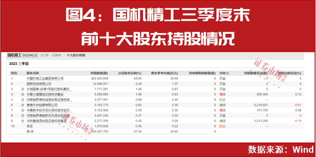 国机精工的前十大股东名单中,同样被公私募基金、陆股通等机构产品占了7个席位,分别位居公司第三至第九大股东,其中华夏大盘精选证券投资基金、华夏数字经济龙头混合型发起式证券投资基金三季度期间对公司完成了继续加仓,交银施罗德启诚混合型证券投资基金则完成了357.76万股的新进重仓(见图4)。