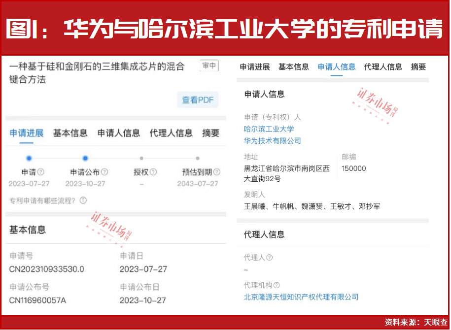 据天眼查显示,10月27日,华为技术有限公司、哈尔滨工业大学申请的“一种基于硅和金刚石的三维集成芯片的混合键合方法”专利公布(见图1),发明涉及芯片制造技术领域。市场分析认为,这项基于硅和金刚石的三维集成芯片技术呈现出的一系列引人注目的特征,很可能在电子领域带来一场技术变革。