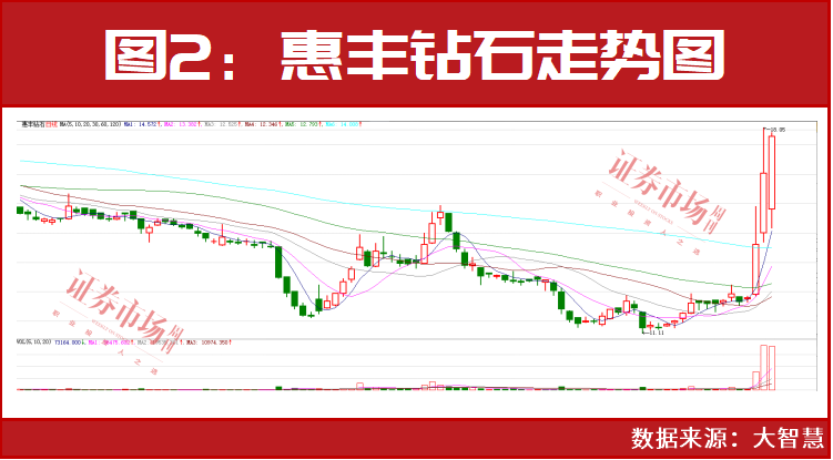 另外值得注意的是,华为申请公布专利至今,培育钻石概念已累计涨超10%。个股中,惠丰钻石累计大涨逾50%(见图2),黄河旋风、四方达、沃尔德、国机精工等公司的累计涨幅也均超过了20%。