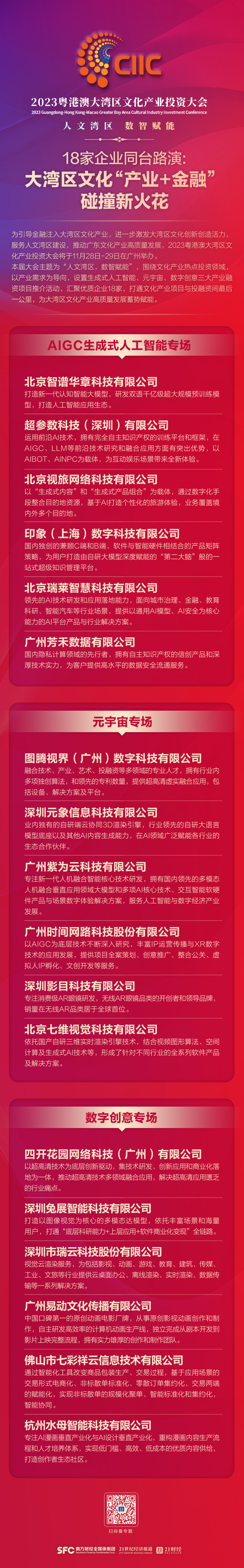 11月28-29日,由中共广东省委宣传部、广东省文化和旅游厅、广东省广播电视局作为指导单位,中共广州市委宣传部、广州开发区管委会、中央广播电视总台广东总站作为支持单位,中国文化产业投资母基金管理有限公司、广东省粤港澳大湾区文化创意产业促进会联合主办,南方财经全媒体集团、广东中科科创创业投资管理有限责任公司、南方文化产权交易所、广州市城市建设投资集团有限公司、黄埔文化(广州)发展集团有限公司、香港文化创意产业发展基金会、澳门文化界联合总会等承办协办的“2023粤港澳大湾区文化产业投资大会(广东·广州)”将在广州举办。