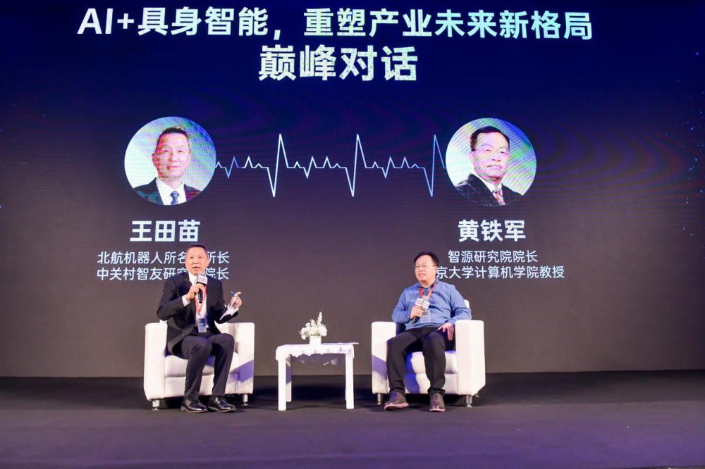 北京大学信息科学技术学院教授、北京智源人工智能研究院院长黄铁军和北京航空航天大学机器人所名誉所长、中关村智友研究院院长王田苗也来到大会现场,就《AI+具身智能,重塑产业未来新格局》这一前沿话题进行了巅峰对话。