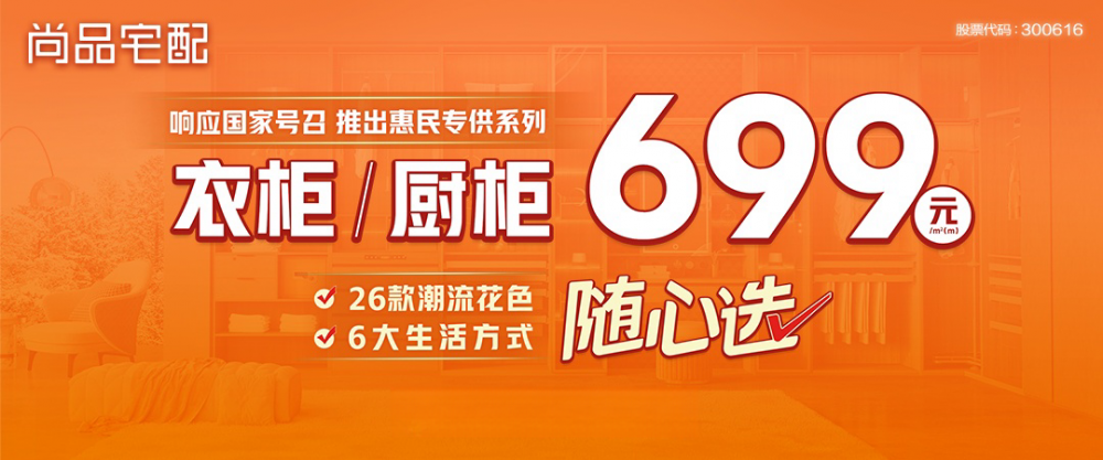 尚品宅配积极响应国家政策,于9月初发布“699惠民系列”,衣柜699元/㎡,厨柜699元/m,提供26种潮流花色,并严选环保健康板材与五金配件,这一重磅惠民政策为激活家居消费市场带来强劲动力。“优质的生活并不应该仅仅是奢侈品的代名词,而应该是每个人都可以享受到的。”尚品宅配相关负责人表示,希望通过699惠民专供系列,让更多的人享受到高品质家居生活带来的便利和舒适。
