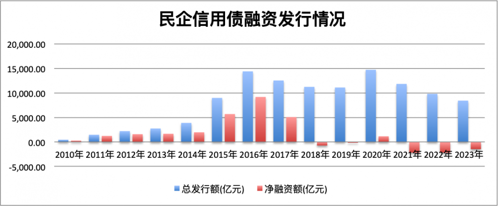 Wind数据显示,2010年-2016年间民企债券发行规模和净融资规模稳步增长。尤其在2015年,随着公司债扩容,民企信用债融资规模大幅增加,民企信用债总发行量于2016年突破万亿元,并且当年净融资额高达9182亿元,达到历史峰值。