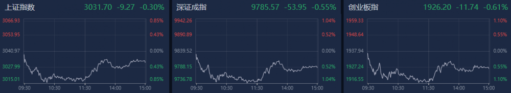 A股三大指数上午震荡调整,午后跌幅收窄。北交所个股全线上涨,北证50指数收盘大涨超11%。南财金融终端显示,截至收盘,上证指数跌0.30%,报收3031.70点;深证成指跌0.55%,报收9785.57点;创业板指跌0.61%,报收1926.20点。