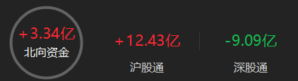 北向资金全天净买入3.34亿元,其中沪股通净买入12.43亿元,深股通净卖出9.09亿元。