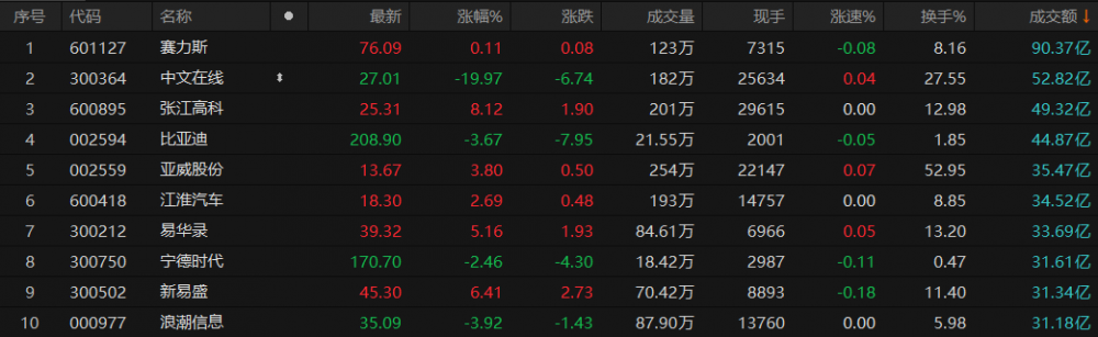 个股方面,赛力斯成交额排名第一,全天成交90.37亿元。中文在线、张江高科、比亚迪、亚威股份成交额同样居前,分别为52.82亿元、49.32亿元、44.87亿元、35.47亿元。