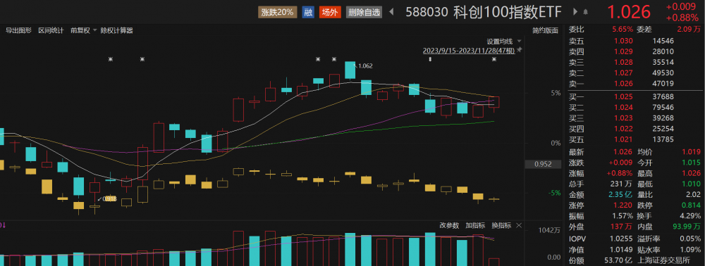 跟踪科创100规模最大的ETF——科创100指数ETF(588030)拉升翻红,现涨近1%,盘中溢价交易,成交额2.35亿元。