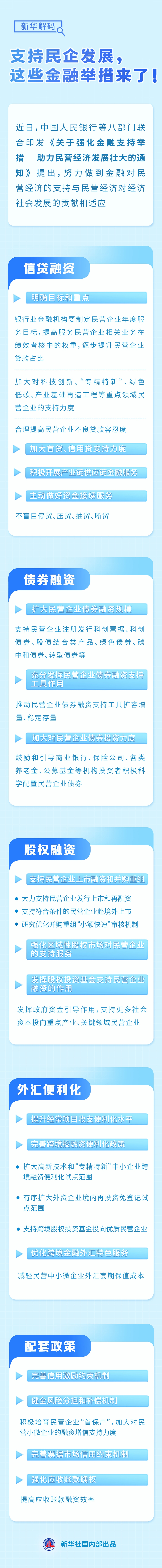 民营经济发展壮大离不开资金支持。中国人民银行等八部门近日联合印发《关于强化金融支持举措助力民营经济发展壮大的通知》,推出25条具体举措,持续加强民营企业金融服务。通过记者梳理,一起看看这些举措将如何支持民企融资。