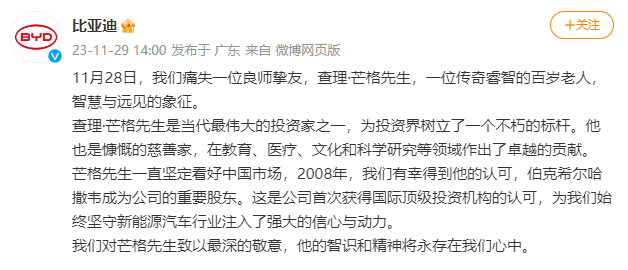 今日下午,比亚迪官方微博发文悼念称,“我们痛失一位良师挚友”,并表示,“查理·芒格先生是当代最伟大的投资家之一,为投资界树立了一个不朽的标杆。他也是慷慨的慈善家,在教育、医疗、文化和科学研究等领域作出了卓越的贡献。芒格先生一直坚定看好中国市场,2008年,我们有幸得到他的认可,伯克希尔哈撒韦成为公司的重要股东。这是公司首次获得国际顶级投资机构的认可,为我们始终坚守新能源汽车行业注入了强大的信心与动力”。