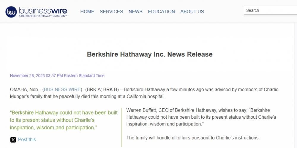 当地时间周二(11月28日),伯克希尔-哈撒韦在其子公司美国商业资讯网站上发布声明表示,董事会副主席查理·芒格(Charlie Munger)的家人告知公司,芒格于当天早上在加州的一家医院中安详去世,享年99岁。