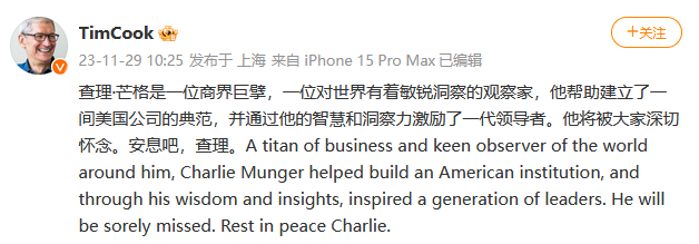 面对查理·芒格去世消息,今日上午,苹果 CEO 蒂姆・库克(Tim Cook)在个人微博发文悼念,表示“查理・芒格是一位商界巨擘,一位对世界有着敏锐洞察的观察家,他帮助建立了一间美国公司的典范,并通过他的智慧和洞察力激励了一代领导者”。