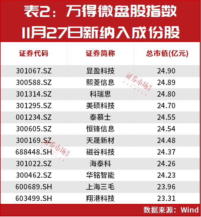 值得一提的是,万得微盘股指数成份股每日更新,11月27日,又迎来了12位新成员,显盈科技就是其中之一。此外,万得微盘股指数最新纳入的成份股还有熙菱信息、科瑞思和美硕科技等(见表2)。