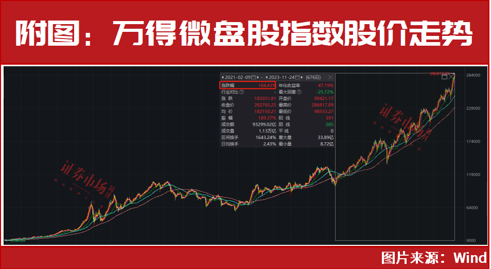 其实,拉长周期来看,微盘股在近几年均涨势不俗。以万得微盘股指数(8841431.WI,主要包含全部A股中市值居于后400的个股,剔除ST、*ST、退市整理股、首发连板未打开的标的)为例,自2021年2月下旬至今即持续向上运行,近三年时间涨幅已接近两倍(见附图)。