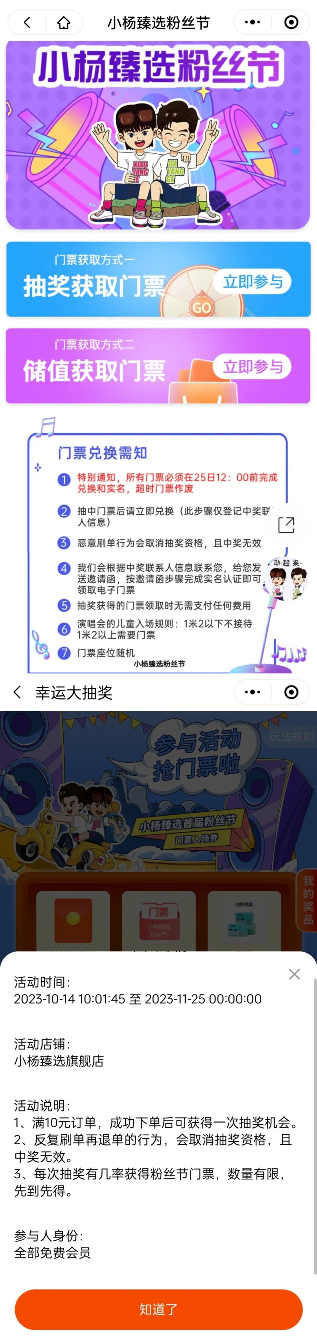 早在10月中旬,小杨哥团队就已开始为这场演唱会预热。而门票的主要获取方式有两种,一是在“疯狂小杨哥”“小杨臻选”等直播间抽奖,二是在“小杨臻选”的小程序抽奖或兑换。